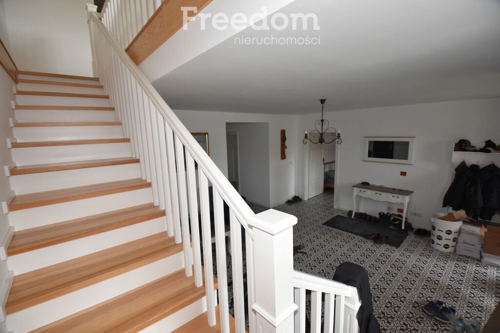 Piętro Drewniane schody prowadzące do jasnego salonu połączonego z